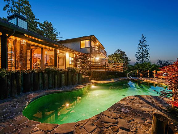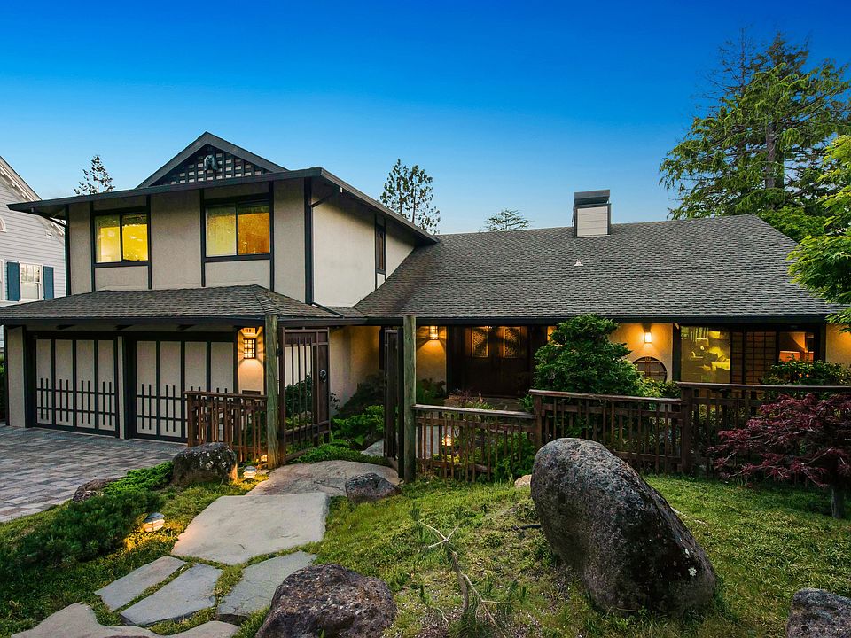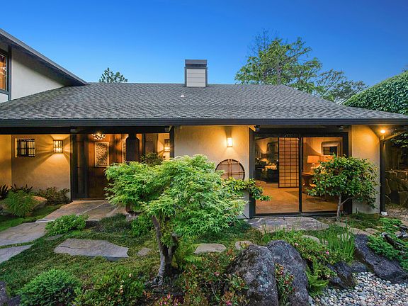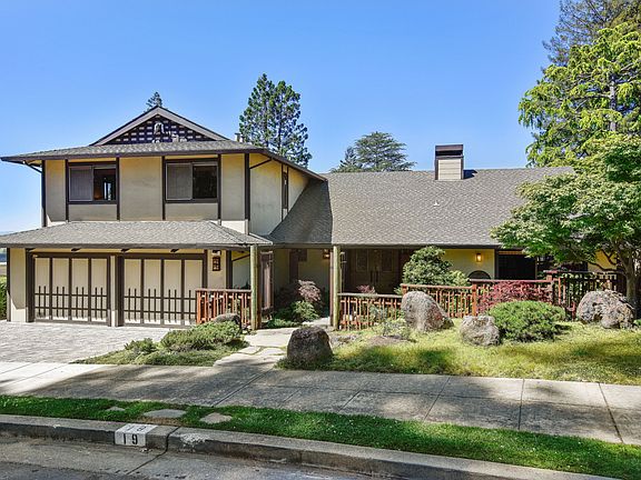 The charming house at 19 Sotelo Avenue reminds one of a Japanese Tea House set in an exquisite Japanese garden. The wood gate opens to the serenity of a meticulously maintained garden. The traditional Japanese landscaping includes Bonsai Japanese maple trees, azaleas and Mondo grass. Smooth flat stepping stones form a path to the entry and far side of the house. Round stones represent a meandering stream, while large volcanic rocks punctuate the garden.  The elegant front door is trimmed in a lattice-like manner with richly carved panels and striking hardware, original to the house. Two small statues of Daikokuten, one of the Seven Lucky Japanese Gods, sit in the front and rear small gables in the roof and represent good luck and prosperity. The fencing, lattice work, bamboo trim and large round porch posts continue the Japanese design on the exterior.    As you enter, the serenity of the front garden continues throughout the house. The gracious living room with grass cloth walls has a dramatic floor-to-ceiling lava rock gas fireplace which adds texture and interest to the room. The Japanese décor is carried out with Shoji screens that open to lovely views of mature trees, glimpses of the bay and to the rear garden with its swimming pool. More Shoji screens slide to separate the living room from a den/office space with wet bar.    In the dining room, large windows and with Shoji screen provide views to rear deck, pool and gardens, while an elaborately carved wooden panel screens the entry hall. The adjacent kitchen is efficient with built-in appliances and an island with two cook tops - one a grill. The spacious family room offers a comfortable space to relax or work. The gas fireplace has copper trim, and the room is lined with book shelves, cabinets and a built-in desk.  The casual dining area overlooks the rear garden and trees with a view to the west. Sliding glass doors open to the large deck overlooking the swimming pool. Built-in benches on two sides of the deck offer additional seating, and a retractable awning increases shade on the sunny deck.    A graceful curved stairway with a bold newel post leads to the master bedroom suite and two additional bedrooms and bath.  The master bedroom has its own balcony and overlooks the rear garden with glimpses of San Francisco Bay.  The room is large with space for lounging, two closets, a built-in dressing table and an adjacent roomy walk-in closet. The master bathroom has double sinks, a bath tub and a separate shower. Shoji screens cleverly conceal the toilet.  The two upstairs bedrooms overlook the street. The second bedroom has a built-in bookcase and large closet with shelving. The third bedroom has a built in dresser and separate closet. The landing has two linen closets for more storage. The rear garden continues the Japanese design. Smooth flat stones surround the free-form pool, and large round wood posts form retaining walls in the garden. A convenient changing room with toilet and shower is just steps away under the house. The lowest level of this sunny garden contains a raised bed, perfect for growing vegetables and herbs.  Fruit bearing fig, apple and plum trees grow along the Japanese style fence on the property line.  The house has security cameras, a powder room off the entry, a laundry room off the kitchen and interior access from the garage.    19 Sotelo Avenue was built in 1972 for an Oakland real estate developer and was designed by Robert Klemmedson, a well-known local mid-century architect. He had a successful career building custom homes throughout the 1950s, 1960s, and 1970s. Many of his homes are in Oakland and Orinda.