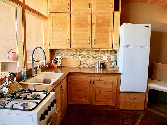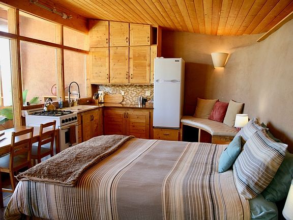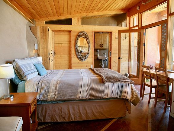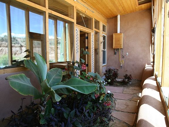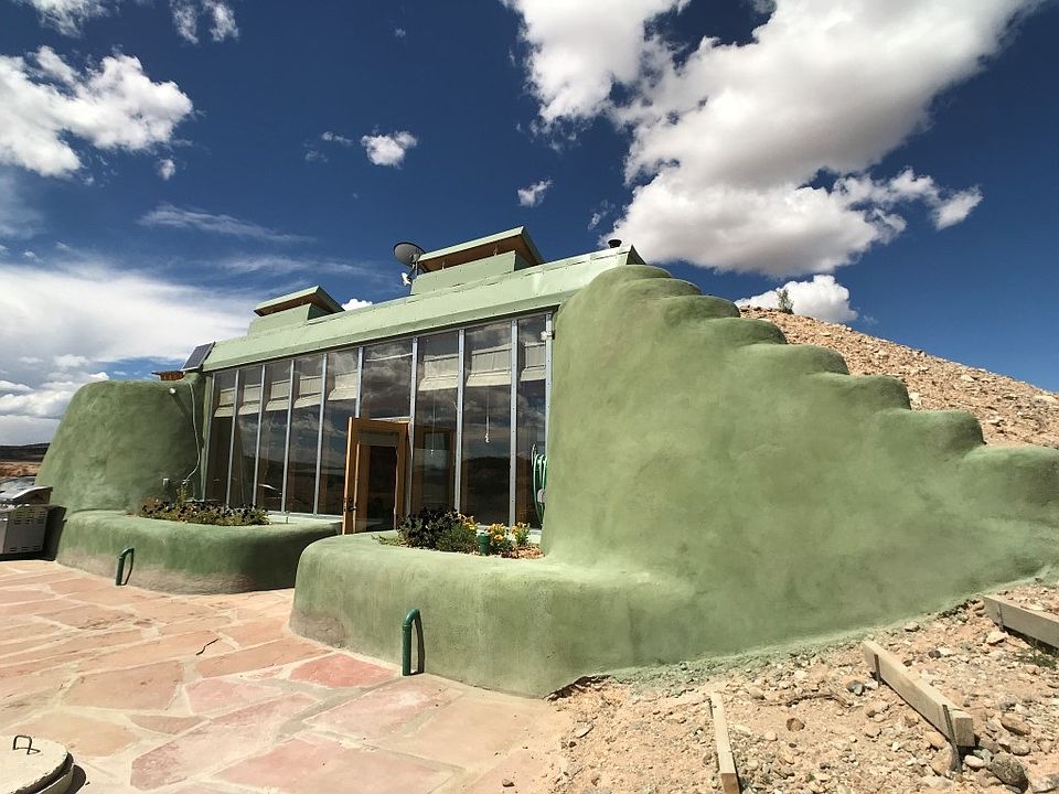 Enjoy complete Off-Grid living your beautiful 500 sq.ft. studio Earthship. You have a bedroom/living room, 1 bathroom, and full kitchen.Close to Taos and the Ski Valley, with big sky nights. The upper portion of the lot would be a great place for a gazebo for 360 deg views of Taos Mesa. The Greater World Community also has 340 common acres of hiking trails and common space for community landowners. The community well provides water in dry years when catchment may be insufficient.