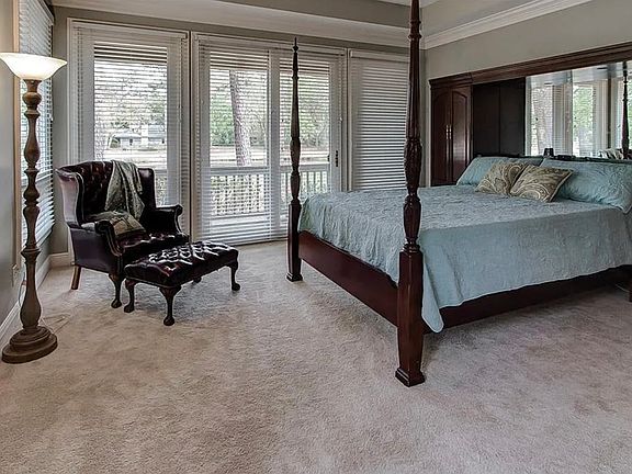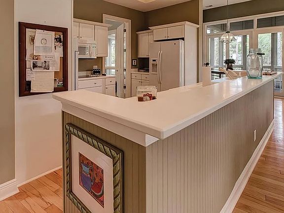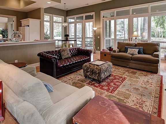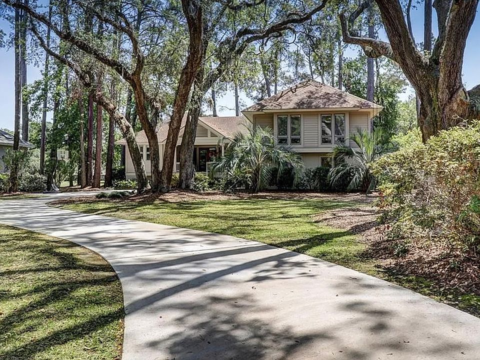 This newer style home is situated on an oversized & deep lot (approx .66 acre) with 2 beautiful mature Live Oak trees & offers views of a lagoon plus the 13th green & 14th fairway of Heron Point course. Located on a cul-de-sac near all the amenities of Harbour Town. 3 bedrooms, 3 baths & a 2 car garage. Kitchen opens to family room with fireplace. Some features include; high ceilings, hardwood floors, wet bar, 3 covered porches plus a screened porch. Master suite has his & her walk-in closets. Master bath has double vanity with separate shower and Jacuzzi tub. 3,054 sq. ft.