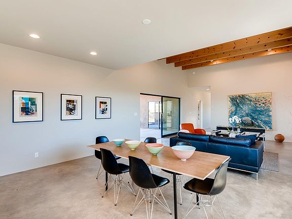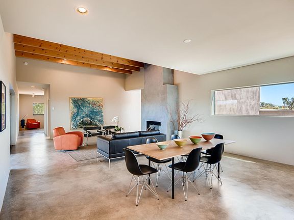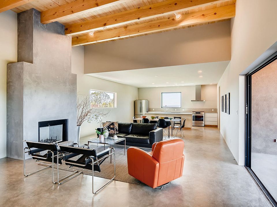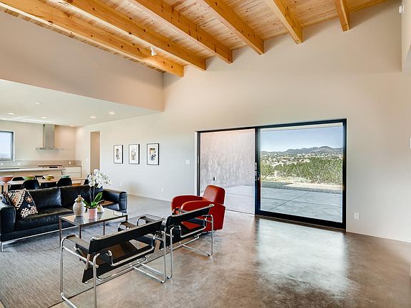 Smashing contemporary design and a new floor plan by design/builder, EJ Jennings, located on Spur Ranch Road with panoramic, "big" views of the Sangre de Cristos and Jemez mountains. The dramatic open concept is ideal for entertaining and modern living with the living room opening onto a expansive portal. The cook's kitchen offers a generous center island , sleek Euro style cabinetry, quartz counter tops, tile accents, stainless appliances, and inset stainless sink. Home offers rare new construction, hard edge lines, smooth finished concrete floors, high efficiency heating system, R50 roof and R30 walls, Cat 6 wiring, sound insulation for interior walls, "Western" brand windows which are high end commercial quality, beams in living area and all of today's current building code standards. Open concept living/kitchen/dining area, master suite with spacious master bath which is beautifully tiled, split plan with sizable second bedroom and an oversized/generous 3rd bedroom which is designed to be studio/work area. The Galisteo Preserve is near by for hiking and your enjoyment. Natural gas, Eldorado water and a 2.7 acre lot. Very short travel distance on dirt road to Hywy 285.