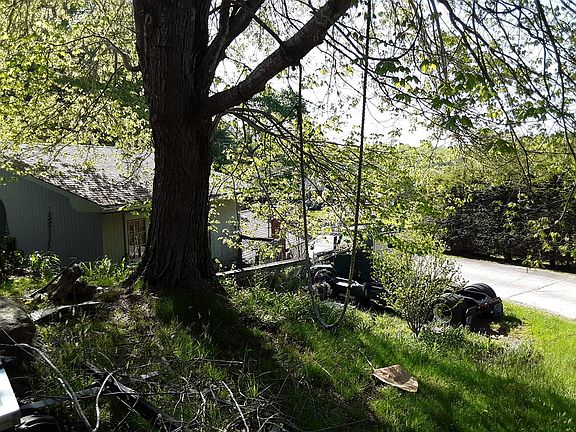 Small home with good bones, needs TLC. Parcel is a small hill with top flattened into spacious level yard, w/room for possible second home. Sides of hill are graded & terraced, covered with beautiful shrubs and perennial flowers. Mature trees anchor the property. Home has been expanded several times since original rock core was constructed. Basement is fully finished, w/below-grade BR w/walk-in closet. Rest of the basement is laundry/workroom w/tile floor & walk-in shower. Access to the outside is through a small sunroom, opening to a small private patio on one side, (also accesible from BR), & landscaped terrace on the other, made private by tree-hung English Ivy. Upstairs, original living area has native rock walls, BA & stairwell, door to porch and paved parking, and open entry to the kitchen-dining, added in 1960, Further addition of BR & full bath opens off this room, (circa 1990). Bedroom has private deck and storage. 20x40' block-built workshop/garage has its own driveway further around the circle, also has storage room (root cellar) set into the hill. Above this, 2-room apt with full BA has been added. Small greenhouse & tool shed on site.