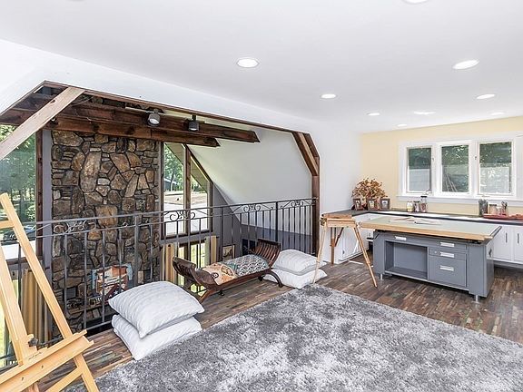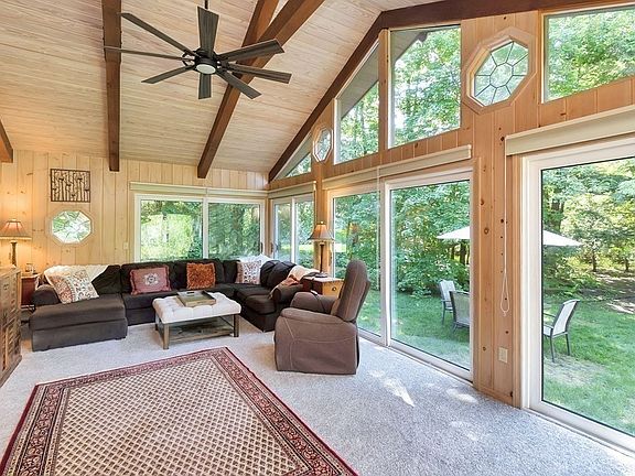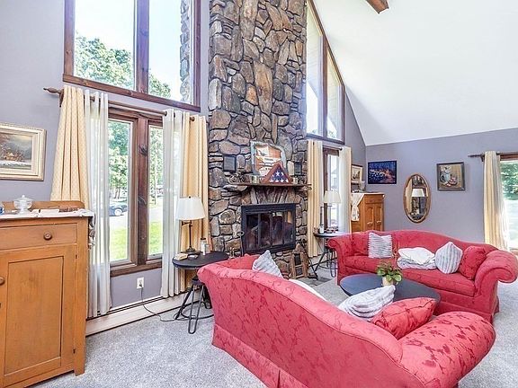 Welcome home to this beautiful A-Frame Chalet Contemporary that resides in Bridle Path Estates! Some great features include: Stunning floor to ceiling field stone fireplace with vaulted ceilings offering plenty of natural sunlight, updated kitchen with new appliances & large bay window, new renovated bathroom with a soaking tub, fresh paint and newer carpeting throughout. A spacious loft area with plenty of storage, first floor master bedroom, 1st. floor Laundry located in a flex space, den or additional bedroom. A massive family room with Cathedral ceilings lined with glass & glass sliders to a private back yard. Attached 2 car garage, whole house fan, full basement dry and ready to finish. Many perennials, newer shed & Redwood wood fired hot tub to remain. This property is a pleasure to show!