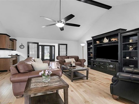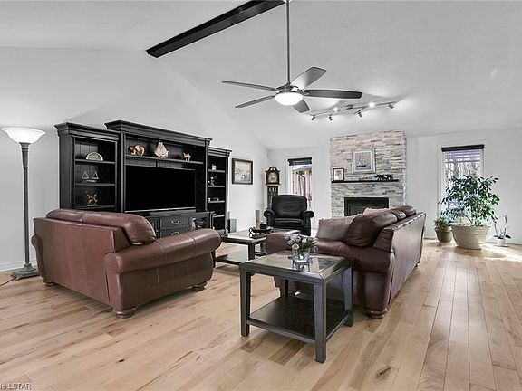 Indulge in the epitome of luxury at Hawks Ridge, your exclusive retreat from urban chaos. This meticulously crafted 3+3 bed, 4 bath custom ranch in the coveted Coldstream hamlet offers refined living. A grand entrance unveils a spacious great room, soaring vaulted ceilings, and a captivating gas fireplace. Delight in culinary excellence in the custom kitchen with cherry cabinets, a granite island, and stainless steel appliances. The main floor boasts a lavish primary bedroom with a 5pc ensuite, while two additional bedrooms and bathroom provide plenty of privacy for family and guests.The basement, adorned with 10ft ceilings, features three bedrooms, 2 additional bathrooms, an entertainment haven (pool table and all accessories included), office, and ample storage. A 26x30 workshop/garage complements the two-car attached garage and expansive driveway. Step outside to a cedar deck with a Gazebo, embracing a landscaped, park-like oasis surrounded by mature trees. Recent upgrades include most windows, all doors, lighting, hardware, security, thermostat, vanities with quartz countertops, roof, exterior, flooring, and appliances. Live lavishly, just 20 minutes from London and Strathroy, minutes from highway 402. Welcome home to unparalleled elegance. Book your private showing today