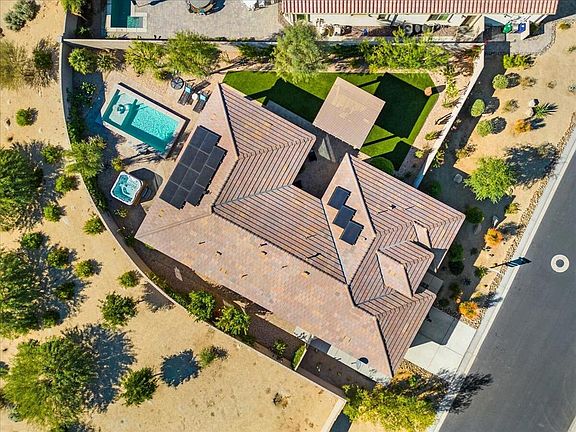 Introducing this grand scale Plan 5 Prairie Haven in Phase 1, offering 2 beds, 2 baths, and an office with sleek barn doors, flooded with natural light, set on a .24-acre lot with only one neighbor allowing you to take in the incredible unobstructed panoramic mountain views and natural surroundings. Step onto 12'x24' porcelain tile flooring throughout. The kitchen boasts granite counters, suede finish backsplash, Whirlpool appliances (including refrigerator), pendant lighting, and a walk-in pantry. A central courtyard leads to the pergola with fire table. Indoors, the cafe and gathering room open seamlessly to the outdoors via double-opening center sliding glass doors. The owner's suite features dual vanities, a shower with bench, ample linen storage, and a spacious closet. Relax on the fully covered patio with motorized awnings, overlooking the refreshing pool with tanning shelf and glass water feature, or unwind in the therapy spa. The 2.5-car garage includes its own AC system and pre-wiring for an electric car. Enjoy savings with a Tesla SOLAR LEASE of $101.44/mo. Plus, this home comes fully equipped with a washer, dryer, and all wall-mounted TVs.