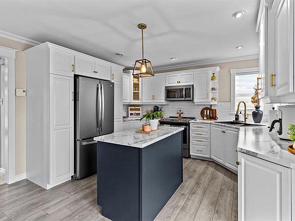 New modern kitchenSleek cabinetryBeautiful islandStainless steel appliancesPropane fireplaceCozy home officeWalk in pantry