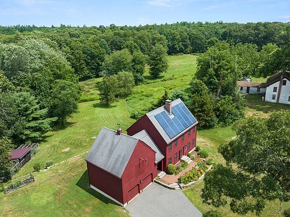 Situated on a beautiful scenic road, this stunning quintessential New England colonial offers all the beauty of the serene outdoors combined with a custom-built home. The exterior has all-new paint, new windows, solar panels, a beautiful brick walkway & rear patio. The interior boasts new paint, newly finished pine floors, a cabinet-packed custom birch wood kitchen w/ a spacious center island, gas cooktop & double oven. The large family room offers exposed locally milled beams for added warmth and a fireplace w/ woodstove insert atop a brick and granite hearth. Work from home in your 1st-floor office with french doors for added privacy. Alongside the extra large 2 car garage w/ walk-up storage loft, enjoy the convenience of a separate side entry with 1/2 bath and laundry. The 2nd floor consists of 3 generously sized bedrooms including the primary suite with a relaxing bath and large walk-in closet. The LL is partially finished with bonus access to the garage. Open House Sat & Sun 11-1