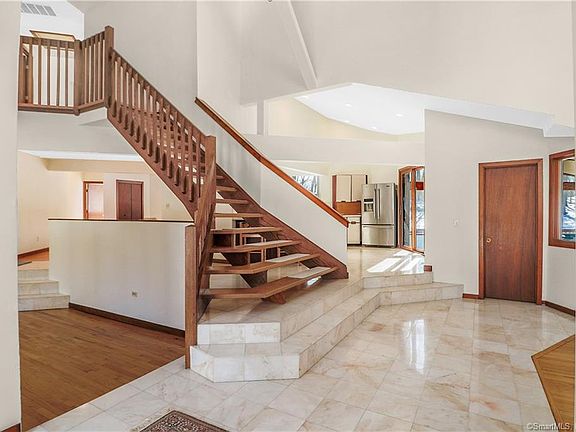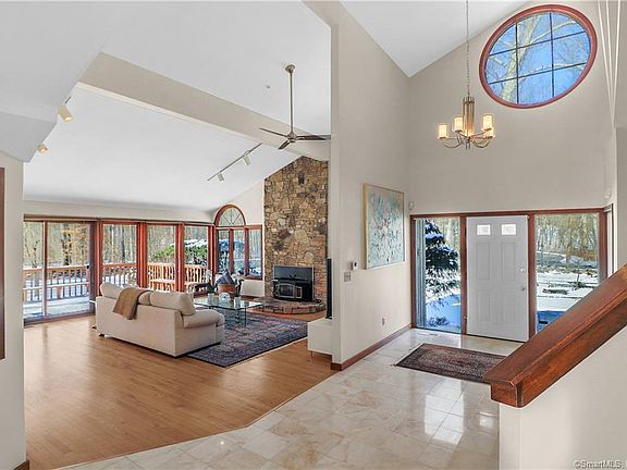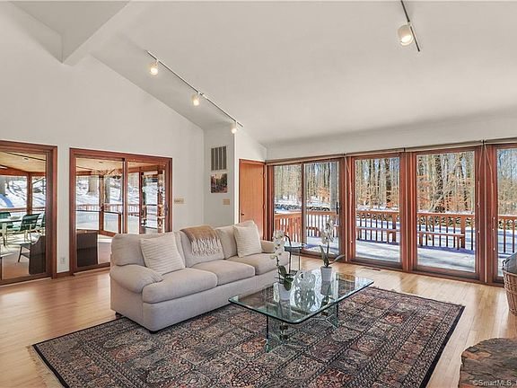 Lower Weston Gem! This contemporary 5 bedroom, 3.5 bathroom home sits on 2 pristine acres surrounded by the Aspetuck Land Trust. Come see the 19-foot ceilings, gorgeous wooden staircase, large sun-lit windows which create an indoor/outdoor living environment, large family room and living room with stone fireplace. This home has magnificent wow-factor. Recently updated master bathroom with deep soaking tub, double vanity, and spacious shower. First floor has a bedroom with en-suite that would be a perfect in-law space/au pair space or guest room. This home boasts a screened in sunroom and expansive deck with the most serene views. Other amazing features include a Passive Solar System to create more energy efficient heating. Walking distance to hiking trails or explore off the beaten path in your own backyard. This home is located towards the beginning of a long cul-de-sac street. Close to Westons award winning schools, downtown Weston, Bisceglie Park, Aspetuck Country Club, Weston Field Club, Weston Racquet Club and much more. Dont wait on this home, a must see!