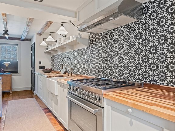 Located in Provincetown's historic West End, this fully renovated two-bedroom, two-and-a-half-bath townhome blends historic charm with modern luxury. The first level features antique wood floors, exposed beams, a living room with a gas fireplace, powder room, dining area with built-in storage, and a chef's kitchen with high-end appliances. The resort-style bluestone patio offers stacked rock walls, integrated lighting, and a storage shed. The second floor boasts a primary suite with vaulted ceilings, a gas fireplace, open closet, Miele washer/dryer, and a luxurious en suite bath. The guest suite includes a custom Murphy bed, en suite bath, and a versatile work/play area. Additional amenities: two-zoned HVAC, off-street parking, wifi lighting, new exterior paint ('23), and a new roof ('24). Perfectly situated for easy access to town and the beach.