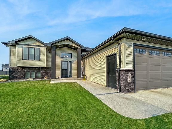 Welcome to the stunning custom-built, one-owner, split foyer home nestled in the highly sought-after "Bluffs" subdivision of Minot. From the moment you arrive, you'll be captivated by the impeccable curb appeal, enhanced by the harmonious blend of stone, stucco, and vinyl shake accents. Meticulously crafted by the renowned local contractor, Future Builders, and featuring four bedrooms and three baths, this home exemplifies top-notch construction where no detail has been overlooked. Step inside and be greeted by an inviting open layout that seamlessly combines style and functionality. The kitchen is a chef's dream, boasting exquisite granite countertops, complemented by a tasteful tile backsplash. Crisp white cabinets and stainless steel appliances create a sleek and modern aesthetic. The practicality of a bonus kitchen pantry and a generously-sized island adds to the convenience and storage options. Adjacent to the kitchen, the dining area opens up to a spacious composite deck, offering the perfect space for entertaining or relaxing outdoors. With its low-maintenance composition, you can spend more time enjoying the views and less time on upkeep. On the main level, you'll find a well-appointed guest bedroom and bath, providing comfort and privacy for visitors. The true highlight awaits you in the expansive master bedroom, boasting ample space, TWO walk-in closets, and a private en-suite bathroom complete with double sinks and a luxurious tile shower with dual shower heads. As you venture downstairs, you'll discover a daylight family room that is both grand and inviting, providing an ideal space for relaxation, recreation, or social gatherings. Additionally, this level features two more bedrooms, perfect for accommodating family members or guests, along with another well-appointed bathroom and laundry room. Outside, the property is adorned with mature landscaping, thoughtfully curated with decorative rock, tasteful curbing, and a convenient sprinkler system, ensuring a picturesque and easy to maintain yard. The triple attached garage also has a floor drain and heat and ample space for extra storage. Located on a quiet street within walking distance to John Hoeven Elementary School, the Minot Country Club, and newly opened 1685 Restaurant, this is a location that can't be beat!