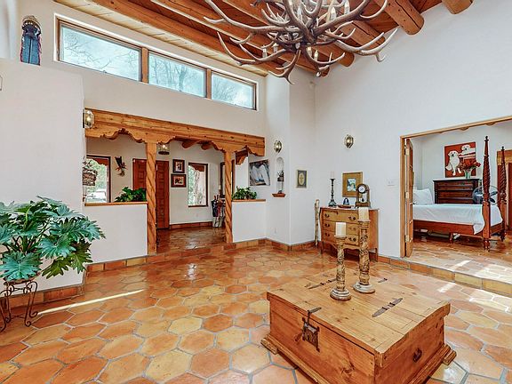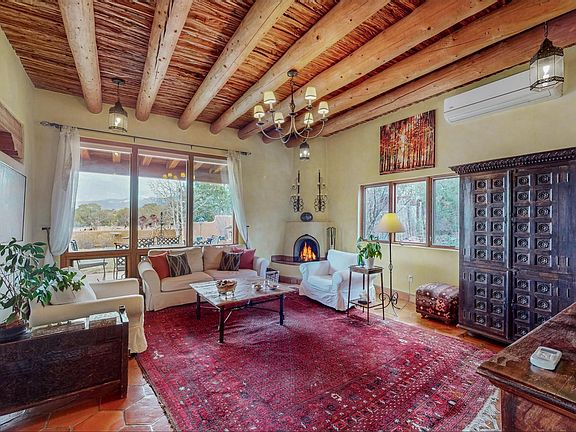 Nestled on over 5 usable Northside acres with stunning direct views of the Sangre De Cristo Mountain Peaks, this home exuberates Santa Fe charm! In a small private enclave of custom homes, this home has 3 cozy fireplaces, saltillo tiled floors, talavera tiled bathrooms, vigas and herringbone ceiling throughout. The many skylights bring the New Mexico light indoors. Along with radiant in floor heating, there are two mini-split units which will help keep your home comfortable. Outside mother nature flourishes with covered portals, mature trees & landscaping. There are horse friendly riding & hiking trails nearby. Come take a look and imagine the