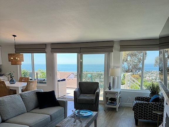 What a view in a completely remodeled condo! Walk in the front door and you will be astounded at the panoramic view, all the way to Dana Point Harbor. Every bedroom has a view also. Kitchen and all 3 bathrooms were recently remodeled that also included painting throughout, flooring, new interior doors, new windows, custom window coverings including motorized blinds in living area to maximize the views from inside. This unit is not split-level like most other units in complex; this unit is 2 floors only with large bedroom and bathroom on main floor for access. Oversized deck off living room. Central heating and air. Attached two car garage with overhead storage. End unit with only one attached neighbor. Walking distance to downtown restaurants and shopping.