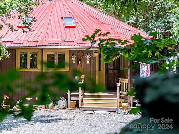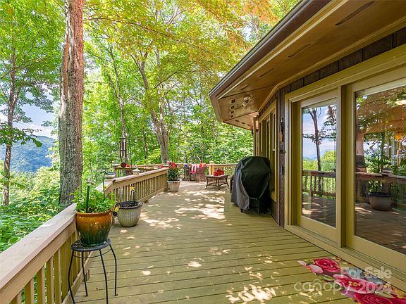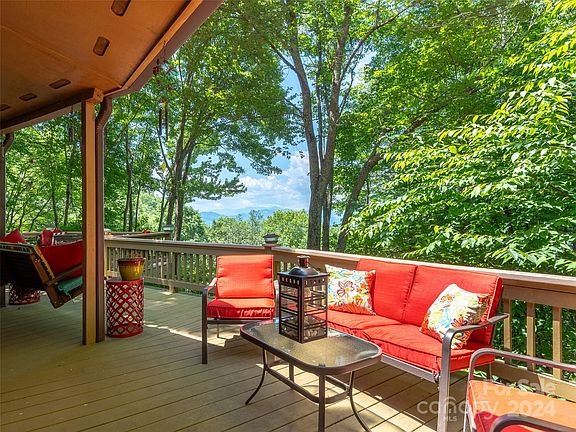 This 2 BD, 2 BA Deltec home is like living in a treehouse! Amazing long-range mountain views, whether out on the wrap-around deck or inside looking out the generous windows. Perfect for the full-time resident or as an attractive STR. The beautiful red metal roof has a lifetime warranty. The Chef's Kitchen is amply outfitted and generously supplied with plenty of storage, lovely quartz counters, and a cozy breakfast nook. The great room looks out on the mountain view and is anchored by a large stone fireplace with variable-function, remote-controlled propane logs for extra comfort on cool evenings or winter days. The primary bedroom has a large walk-in closet and a generous ensuite bathroom. Extras include a generator with TeleLink, a bonus room (currently a third bedroom), and all furniture, linens, dishware, and household goods. Everything is ready to start renting immediately! Conveniently located north of I-40, between Asheville and Waynesville.