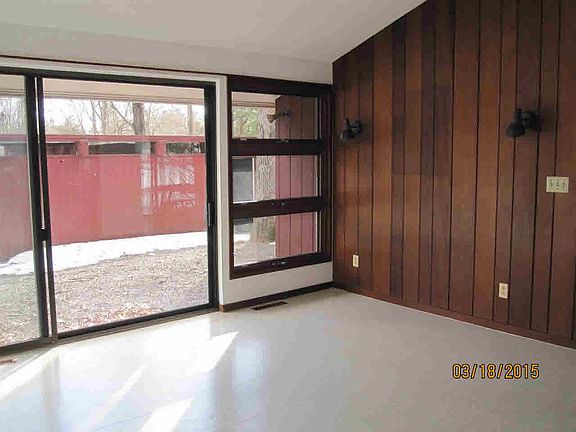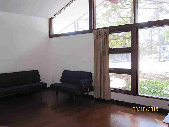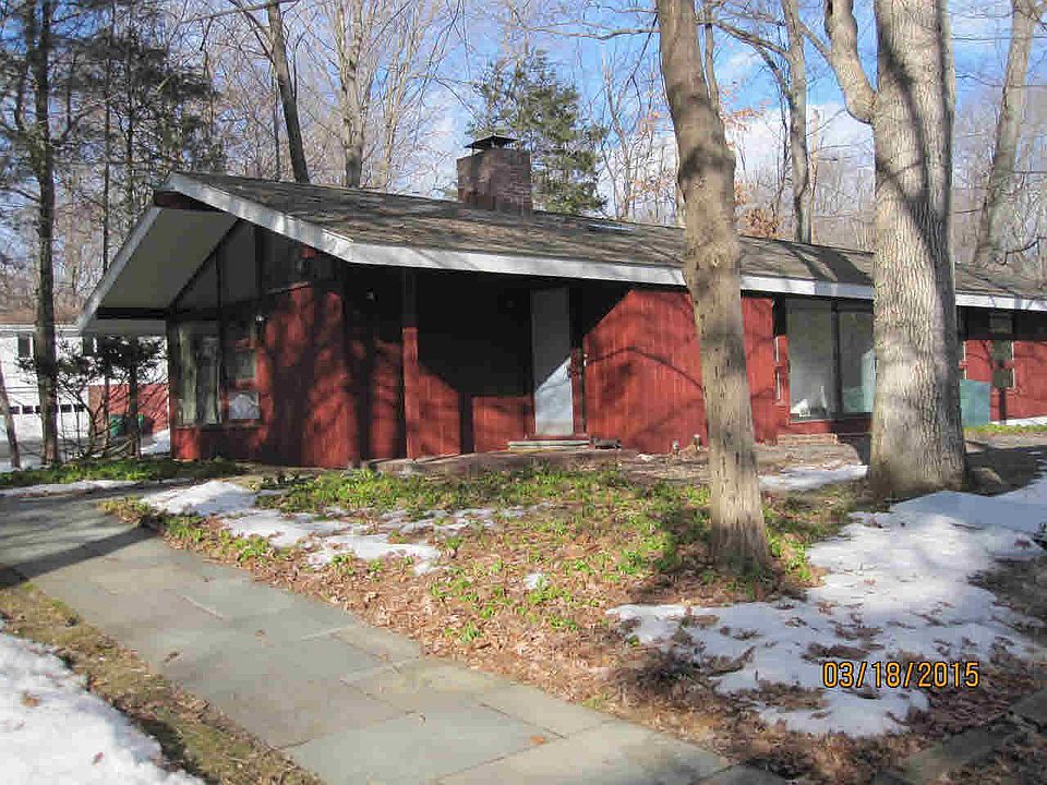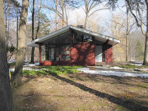 Architecturally designed mid-century modern home--Better Homes and Gardens Idea House of the Year 1955. Original owner has maintained and preserved the original style of this one level, open floor plan home with its cathedral ceilings, built-in drawers, and expansive windows and skylights to let in natural light. Large master bedroom suite has a sliding glass door to private deck. Wide hardwood floors and floor to ceiling brick fireplace in living room. Walk-out basement, new central air. Situated on nearly one acre of park-like property.