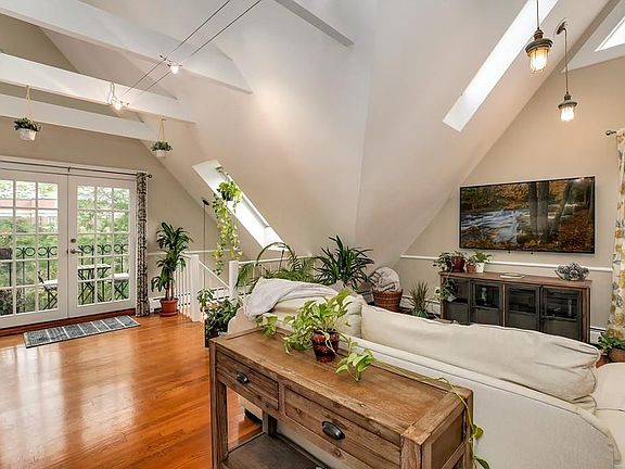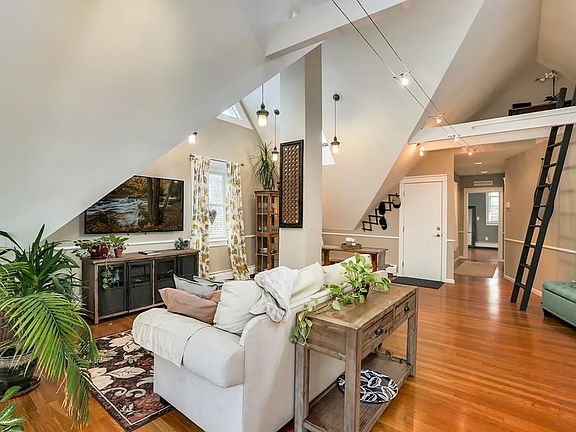 Location! Amazing Victorian Penthouse in a Great JP Neighborhood with a Deeded Garage Space! Stunning, bright, and airy are just a few of the words to describe this chic condominium. Vintage modern charm is evident in this spacious unit featuring beautiful gleaming hardwoods, vaulted beamed ceilings ,retro sliding barn doors,and dramatic skylights and windows. Kitchen opens directly into the living/dining/great room making an ideal space for entertaining. Open the French doors to the balcony for morning coffee or evening cocktail. Bonus loft space provides a cozy place to read a book. Two large bedrooms with lovely ceiling lines and ample closet space round out this hidden gem. In unit laundry, storage, and garage parking complete this rare find. The pet friendly well managed association provides direct access to the best of JP restaurants, shops,Farmers Market, Samuel Adams Brewery, and Stony Brook T. OFFERS DUE @ NOON 9/18
