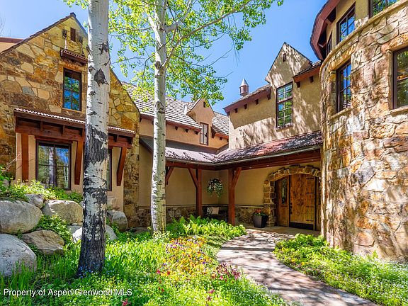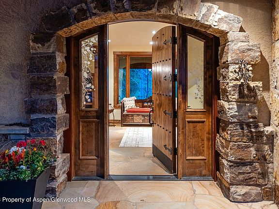 A spectacular mountain lodge on a very private, near 2-acre site in the prestigious Divide neighborhood. Built by Hansen Construction, this property features gorgeous exterior stone work, magnificent trusses throughout the main level, wood floors, custom chandeliers, an extraordinary kitchen chefs will appreciate, a spacious great room that encourages big family gatherings, a den/media room, and generously-sized bedroom suites, including a bunk room. Details like the etched glass at the front door, a bedroom's beveled windows, and subtle, intricate carved wood elements throughout speak to the owners' attention to the highest craftsmanship. Recently refurnished in a contemporary style which brings freshness and light to every room. Outdoors, enjoy a huge deck overlooking the Brush Creek valley, an intimate terrace for al fresco dining, and a hot tub tucked into the aspens. In the fall of 2022, the entire exterior was repainted and new stucco was applied. Ski-access to/from the Dawdler trail via a private Divide ski easement at the end of the cul-de-sac. The trail from Top of the Village to Krabloonik is just below the house, and is another way to access the slopes or to walk to the Village. Family-occupied all summer. 48-hour notice preferred.