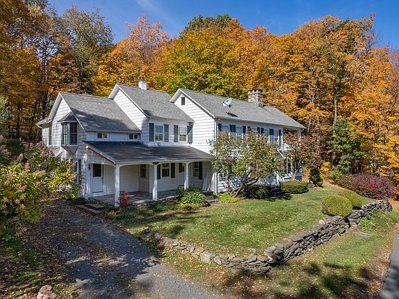 Antique home w/ modern updates & spectacular views on 14 gorgeous acres. Tiled entry w/ half bath, beautifully renovated kitchen w/ cherry floors & custom cabinets, built-in desk, granite countertops, all new appliances incl. 6-burner stove, open to a breakfast area w/ stone fireplace, cherry shelves, & tall windows. Butler’s pantry is around the corner, along w/ laundry room. Generous DR flows into the equally generous LR w/ stone fireplace. Off the LR is a glorious 4-season sunroom. Upstairs, flexible layout w/ 2 staircases offers many options, w/ 2.5 baths & a nice sunny sitting room. One bedroom & en suite bath open to a gorgeous newer deck, amazing mountain views. Behind the house, relax on the Goshen stone patio, or walk up to the gazebo. The land across the quiet road features gentle hills, a pond, a barn w/ concrete floor & two stalls, an additional storage building, & generous two-car garage. Close to Chapel Brook & Bear Swamp conservation areas. Hilltown life at its finest!