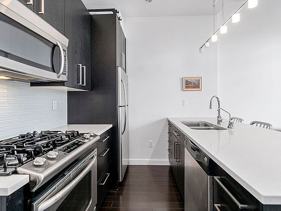 Enter through the large foyer that features custom shelving and into the spacious living and dining room which is perfect for entertaining. Appreciate having two large closets to provide excess storage space. Enjoy the large open kitchen that offers a breakfast bar and is equipped with stainless steel appliances including a large oven, dishwasher, refrigerator/freezer and microwave by GE. Additional kitchen features include large dual sinks with a Grohe faucet and Culligan water filtration system, white Caesarstone countertops and Wenge cabinetry.