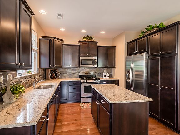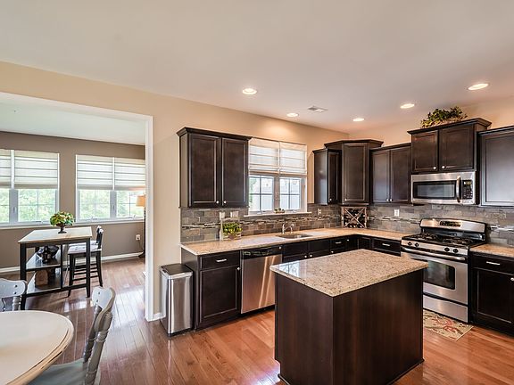 Don't miss this rarely offered "Largest Floor Plan" in the community! This sample condition expansive End Unit Townhome offers over 2,400 S.F. spread over 3 levels and situated on a premium lot that backs to a wooded area. This one of a kind townhome features a full finished walk-out lower level Family Room with a Powder Room and opens to a lovely private stamped concrete patio. The main level features a wide open floor plan which is perfect for entertaining, and is appointed with Hardwood flooring throughout and beautiful crown molding. The Gourmet Kitchen offers gorgeous granite countertops, ceramic tile backsplash, java maple 42" cabinets, a center island, stainless steel appliances, gas cooking, and a Breakfast Nook. The attached Sun Room is located adjacent to the Kitchen and offers endless possibilities. The elegant Owner's Suite is complimented by a bonus Sitting Room, as well as a HUGE walk in closet. The Owners Bathroom features upscale ceramic tile flooring , an over-sized ceramic shower, double vanities, and a vaulted ceiling with a skylight. Bedrooms 2 & 3 share the spacious Hall Bath and the Launder Room is conveniently located on the bedroom level. Both the 2nd floor Deck and ground floor Patio provide a private retreat overlooking wood space and nearby walking trail. The over sized Garage will accommodate 2 small cars or 1 full size car and includes storage/work space. This home is move in ready and surrounded by 21 acres of Open Space. Easy access to Philadelphia and the Lehigh Valley!