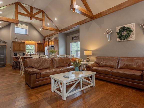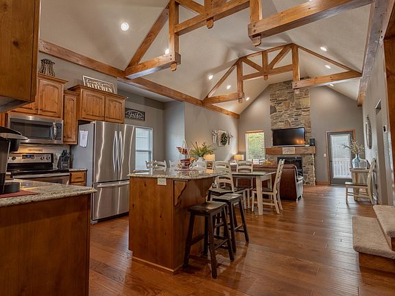 Excellent investment opportunity located in a nightly rental zoned community! This 7B/6.5B property features an open concept with a cathedral, custom beam ceiling, wood flooring, stone fireplace, 2 living areas, zoned heat & air and it comes turnkey ready with tasteful furnishings and decorations. There's a clubhouse, zero entry pool, splash pad and playground located in the community and you can even take a short, gentle stroll down to Table Rock Lake. There's a storage facility right down the road for boat storage which is less than a mile from a public boat launch. Branson Canyon is located between Branson & Ridgedale so you're near Big Cedar Lodge and Top of the Rock for some world class golf; and you're only 6 miles from downtown Branson and everything it has to offer.