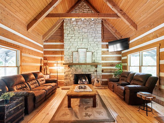 This property offers 19.29 acres of rolling hills featuring a 2,109 SF log home, mature trees, walking trails, campsite, and Nettle Creek meandering through the property. With two covered porches, there is plenty of space to enjoy the sights and sounds of nature. The living room feels like a lodge with vaulted ceilings, knotty Pine floors, and a stone fireplace creating the perfect atmosphere for cozy evenings. The kitchen comes fully equipped with all appliances. Each of the four bedrooms has a unique perspective of the property and features vaulted or beamed ceilings. The 2 baths offer a tiled shower and a claw foot tub. The basement has additional living space, laundry, and storage. Detached 2-car garage provides additional storage.