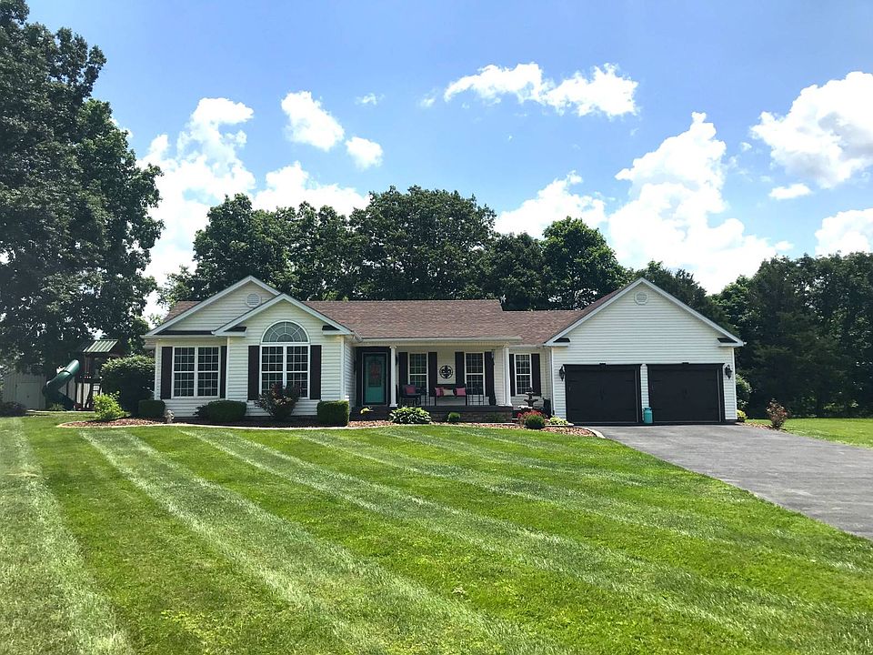 You can tell when a home has been well kept... This is definitely one of those homes as it exudes class & pride of ownership in every square foot inside... And blade of grass outside! This exceptional home offers well appointed living all on one floor featuring 3 bedrooms (1 a larger primary suite offering a generously sized walk-in closet, a European height twin sink vanity w/ a solid granite vanity top, a soothing garden tub, a separate shower & a ceramic tiled floor), a total of 2 1/2 bathrooms (1 off the hallway to service the other 2 bedrooms & a 1/2 bath off the kitchen)... Speaking of the kitchen it would be the envy of any chef highlighted by plenty of white custom cabinetry, gorgeous granite countertops, a decorative tiled backsplash, accent lighting & a separate dining area (includes all the state-of-the-art slate GE appliances - refrigerator, dishwasher, radiant top stove, & built-in microwave)... The kitchen flows openly to the delightful living room so everyone can engage in conversation while meals are being prepared... Plus a large utility room & and an attached 2-car garage w/ lots of attic storage! Inside there are so many upgrades and amenities which make this house - a home - a light and airy floor plan offering designer colors (even in the garage), different selections & colors of beautiful woodgrain laminate flooring throughout the home (not to mention ceramic tile flooring in the garage), first-class lighting & plumbing fixtures, a vaulted living room ceiling, & an arched window, an arched doorway leading down the hall, wainscot trim, decorative ceiling trim in the primary bedroom & so much more! Outside you will enjoy awesome views from either the covered front porch or the rear patio providing evening shade... You will love the custom stamped curbed landscaping all around the home & lots of trees... Plus a nice playset for the kids, a detached 24' X 16' garage/storage building with a lean-to and overhead door & a double asphalt driveway w/ additional parking area... Even the home's foundation is covered by stone for that classy look! As an added bonus... The roof was replaced in the summer of 2023! Everything has been done for you... All you have to do is move in and enjoy all this outstanding home has to offer... including a .90-acre spread of land! Quality never goes out of style... Call MIKE SPALDING to view this home as you must see it to truly appreciate the attention to detail.