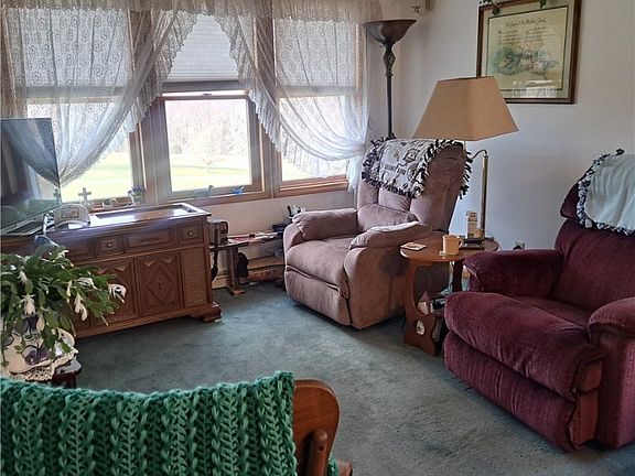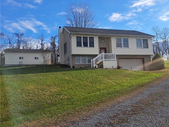 Watch the sunrise and the sunset in this beautiful split entry home nestled on top of a hill. The view is gorgeous. Inside you will find an open dining room, kitchen with oak cabinets and living room. Down the hallway sits 3 bedrooms and a full bath. Beautiful wood trim and solid wood doors accents every room. Down stairs is another full bathroom, laundry room and lots of room for storage as well as the heated integral garage. The wood burner downstairs has a triple lined insulated stainless steel chimney. It is tied into the duct work so it supplements the propane furnace. There is a covered back porch that leads to the two car detached garage behind the home that is also heated. Both garage doors are insulated , allowing the garages to stay warm in the winter.