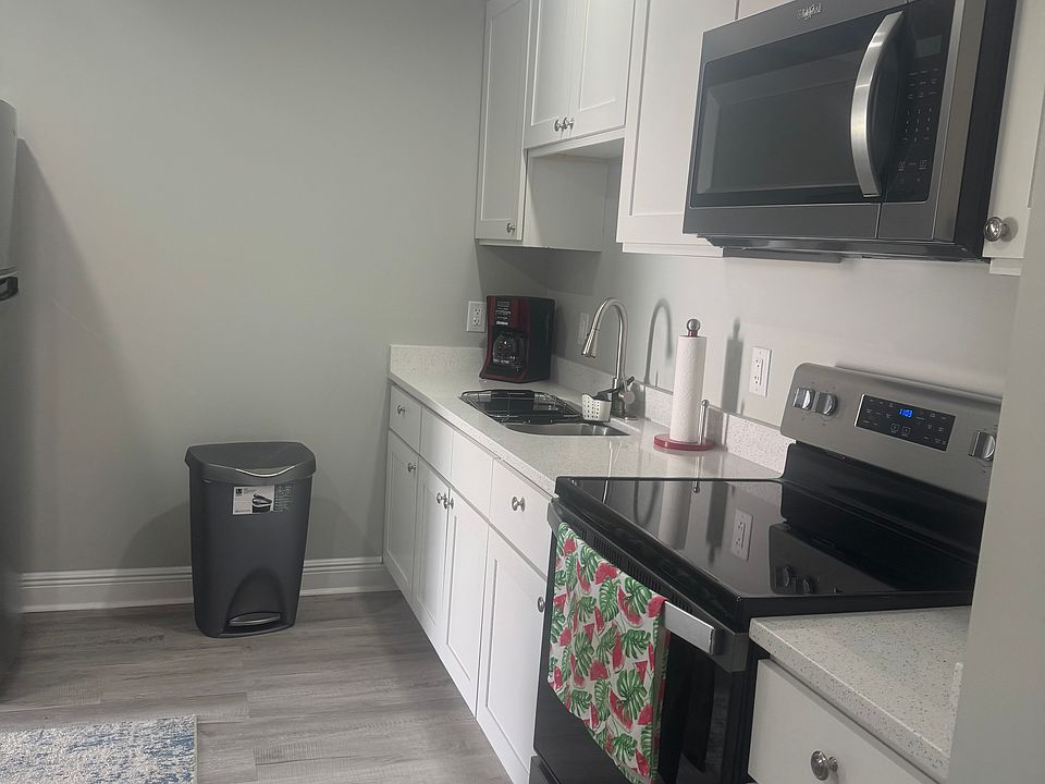 Beautiful fully renovated one bedroom apartment with a back patio, quiet community, for elderly, a single person, a couple or a student. manager on site always available. Soon we will be gating the area to create a private community. We also offer completely furnished all utilities include apartment. 30 days minimum stayed for $1600 all our apartments have their own unique designed and color of furniture's all the same sides. come visit us for an in person showing.