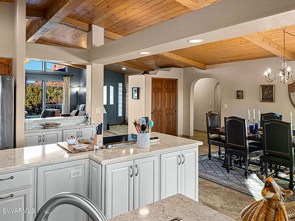5-bathroom vacation home in the Village of Oak Creek, Sedona with 2,239 square feet of southwestern-inspired interiors, all the comforts of home, and unparalleled views of Bell Rock from inside and out.This welcoming Sedona vacation home features a spacious open living area with natural earth tones, natural wood beam vaulted ceilings, and large windows with picture-perfect views of Bell Rock and Sedona's red rock landscapes. The beautiful kitchen is fully equipped complete with stainless steel appliances, a sunny bistro-style breakfast nook, and a full scullery with a washer, dryer, and guest bathroom. The stylish, formal dining area sets the tone for memorable vacation meals or step outside to the back deck for BBQs and alfresco dining, with a quiet backyard for the kids to play.
