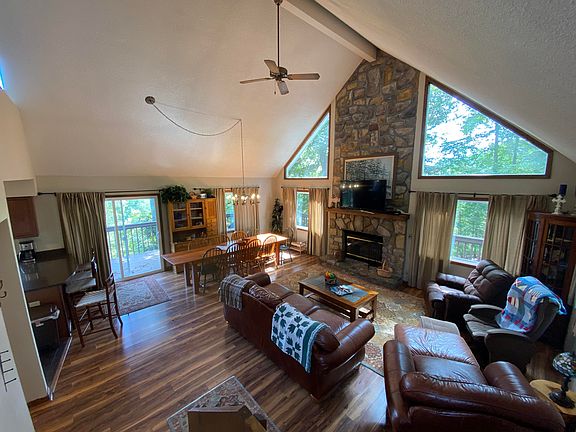 First, know that this house includes the lakeview .54 acre lot to the south. You will find rustic charm in this lakeview home with stunning eastern view of Norris Lake. 2 bedrooms and full bath on the main floor along with kitchen and greatroom, downstairs, downstairs hosts a third bedroom, full bath and familyroom. Upstairs is a sleeping loft with full bath. Decks are composite material. Please note that Deerfield is developer control, and not an HOA. Every home pays $500 fee per year for resort maintenance and security.