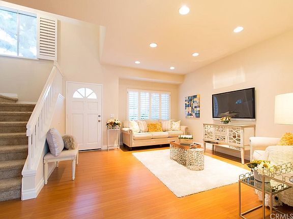 Wow - you have to see this one! Great two story townhome with gorgeous laminate floors downstairs, tall baseboards, fresh custom paint, open kitchen has white cabinets, dark granite counters and stainless appliances, plantation shutters, fireplace in family/dining room... the list goes on! Two spacious master suites with private baths, upstairs inside laundry, neutral décor, washer/dryer/refrigerator included! Large, private patio leads to 2 car garage. Quiet interior location on pretty tree lined greenbelt but easy access to the 5 freeway plus lots of shopping and restaurants. A short 1/2 block to neighborhood park and playground and HOA has two pools. Excellent Irvine schools and no mello roos. This fabulous home has lot to offer at a very affordable price!