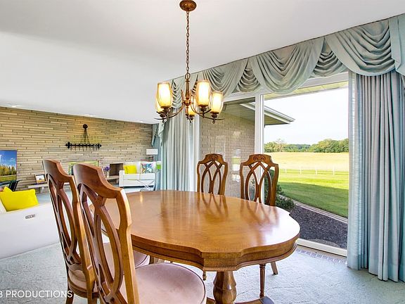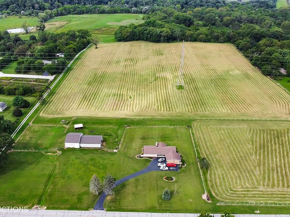 Brick and limestone ranch with spectacular views of 22.5 acres. Classic features include multiple sliding doors, sunken living room with limestone fireplace, large foyer and wide hallway, updated kitchen, 3 bedrooms, and 2 baths. Exterior features include barn with 2 horse stalls, feeding stalls, pole barn additions for equipment and storage, and 4 pastures.