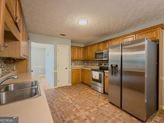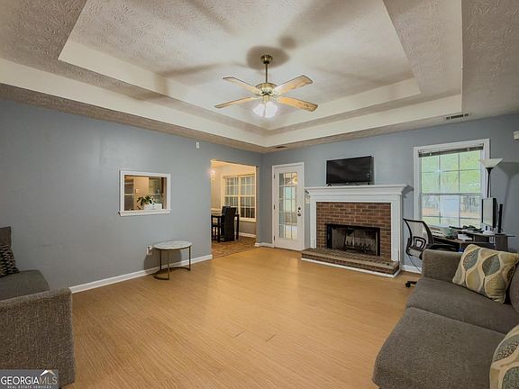 Understated curb appeal and everyday comfort come together in this move-in-ready ranch with a versatile fourth bedroom/bonus room upstairs. A full-length front porch leads to a spacious fireside great room with a tray ceiling. The adjoining kitchen offers newly installed stainless-steel appliances, ample cabinetry, and a tile backsplash with easy flow to the dining area. Fresh flooring through key living spaces adds a clean, updated feel. A large sunroom spans the back of the home, creating a bright second living area with views of the level backyard. Three bedrooms and two full baths are on the main level; the upstairs bedroom provides flexible use for an office, media, or guest space. Outside, enjoy a two-car garage, extended drive, and a detached storage building, plus a backyard with fencing and mature trees. Brick and vinyl exterior accents support low-maintenance ownership. With its practical layout, fresh finishes, and indoor-outdoor living, this home is a strong fit for anyone looking to right-size without sacrificing function.