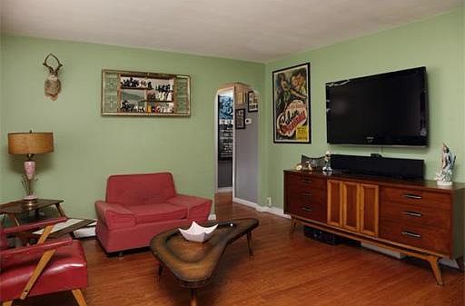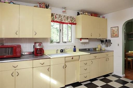 Sparkling with mid-century-modern style, this detached single family ranch with a fenced-in yard is a great value at the price of a condo. Check out the re-conditioned vintage O Keefe & Merritt gas range that looks as beautiful as a 1950s Cadillac. There is a matching retro-looking but newer Northstar refrigerator. The current owners were thrilled to find the unspoiled original Youngstown Steel kitchen cabinetry and authentic boomerang Formica counters. The kitchen door leads out to the deck. There are hardwood floors in the living room, dining area, two bedrooms, and hallway. There is also an office and a full bath on the main floor. Classic 1950s rec room, complete with a bar and built-in vintage television set, in the finished basement. There is also an unfinished workshop and storage area in the basement, with a high efficiency gas boiler, and a bulkhead to the yard. A shed in the yard offers additional storage. Two-car driveway for off-street parking.