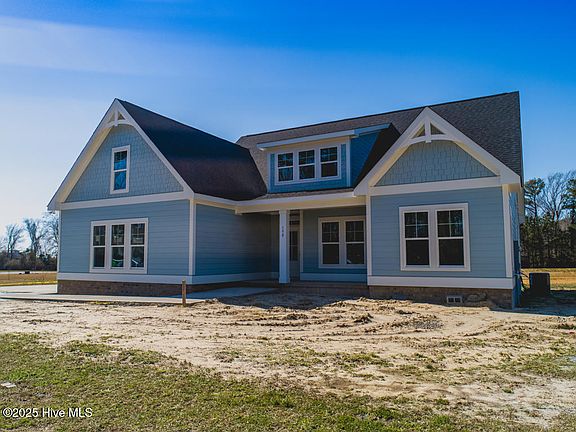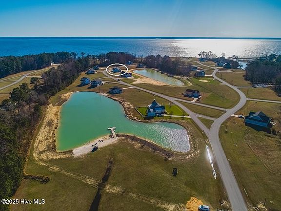 Lakefront living in a home that was designed for views. This floorplan was perfectly planned for a lake lot, and perfect in so many ways. For starters, you're on a double lot, with another double lot on your right and a triple lot on your left. That means your neighbors are very spread out. Check out the picture with the red circle to see what I mean. The exterior of the home has a side load garage, landscaped yard, shakes in the gables, and light blue siding that's very appropriate for this coastal home. The large back porch overlooks the new lake and faces those sunsets that we can't get enough of. Come on in to the foyer that leads you to the wide open great room with a triple sliders. The kitchen and dining are on your left, we love the big pantry and the dining room that has 6 windows, dinner with a view! The primary bedroom has trayed ceilings and a spacious bathroom and closet. Two more bedrooms are on the front of the home with a shared bath. The finished bonus room above the garage gives you so much more flex space. You have 2314sf of heated space and 3137 total when you add in the garage and porches. This is the only waterfront house we have for sale, and it's a gem.