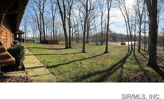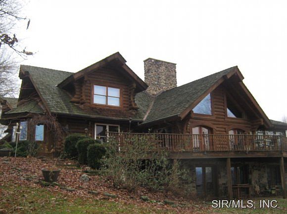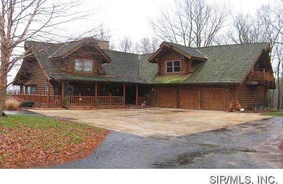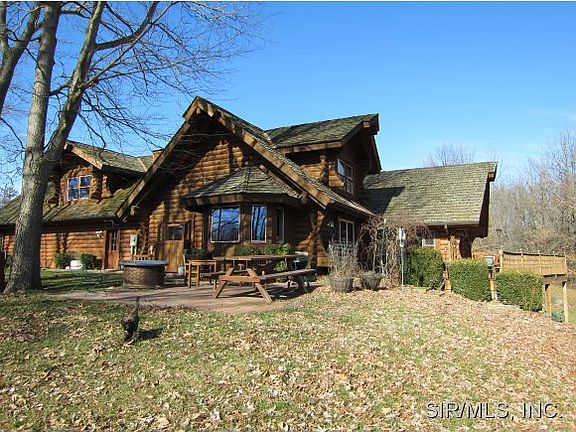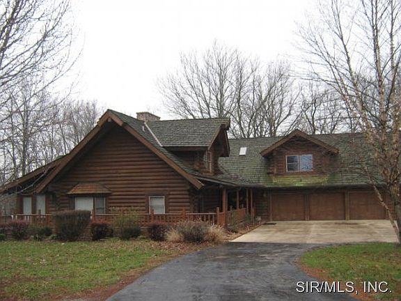 This Log Home is nestled on a secluded 5 Acre Tract. the Elegant foyer opens to a sunken living room with Cathedral ceiling, Stone Fireplace from floor to ceiling, Glass doors that open to wrap around deck. The Kitchen is perfect for entertaining! Designer Kitchen with lots of gorgeous maple cabinets, pantry, plus an Island with approx 10' Breakfast Bar and a large casual Dining Area! Also highlighting the main floor is the Master Bedroom with Master Bath having a jetted tub and separate shower. Completing the upper level living space are a Game Room and 3 Large Bedrooms each having their own Baths! The Walk-out lower level is amazing! Family Room with Stone Fireplace, 5th Bedroom, Wet Bar, Office and Play Area. The View is Spectacular with a Pond. CALL HEART & HOME REALTY FOR MORE INFORMATION 618-283-4436.