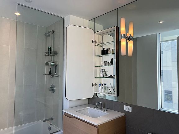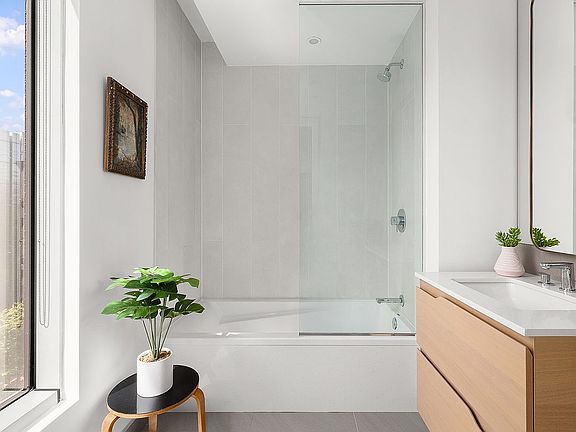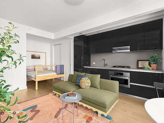 Price improvement! This modern alcove studio provides luxurious accommodations in a stylish and efficient package. A comfortable, light-infused living room with a wall of south-facing windows opens to the chef’s kitchen with sleek Italian grey lacquered cabinetry, Caesarstone countertops and matching backsplash, and upscale Bosch stainless steel appliances, including cooktop, oven, and dishwasher, as well as an integrated Liebherr refrigerator. A cleverly designed recessed sleeping alcove is a cozy and peaceful nook. The serene spa-like windowed bath is outfitted with custom Italian ceramic tiling, Kohler sink, Grohe fixtures, and a soaking tub. The contemporary unit boasts high ceilings and wide-plank smoky oak engineered hardwood floors, efficient split duct electric heating and cooling, a Bosch washer/dryer, and generous closet space with two double closets, including a custom closet system.