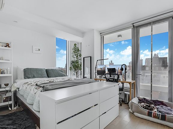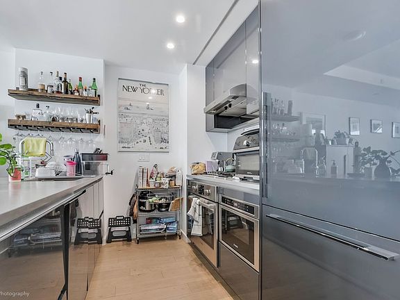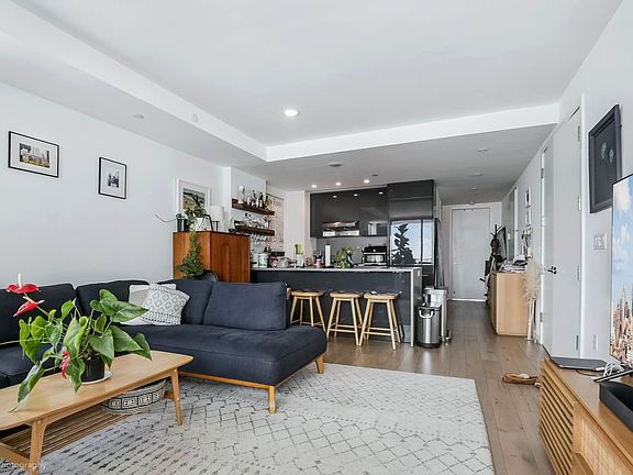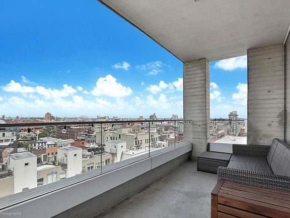 190 South 1st is a stunning modern 1 bedroom sanctuary overlooking all of Williamsburg! The building offers top-tier amenities, including a doorman, gym, terrace garden, and rooftop lounge, providing an exceptional living experience in one of Brooklyn's most desirable neighborhoods. This stunning residence boasts panoramic views of both South and North Williamsburg from two private outdoor spaces, one off the master suite and another off the living roomoffering an additional 191 square feet of private outdoor space. With triple exposures to the North, East, and South, the home enjoys an abundance of natural sunlight throughout the day. The owner has thoughtfully enhanced the space with a custom LED lighting system and high-end electric blinds for the floor-to-ceiling windows, offering both style and convenience. The open kitchen is perfect for both cooking and entertaining, featuring a separate dining and living area. The oversized breakfast bar provides additional counter seating, while the kitchen itself is outfitted with custom Italian grey lacquer cabinetry, sleek Caesarstone concrete countertops and backsplash, and a premium Bosch appliance package, including an oven, four-burner cooktop, and dishwasher. A fully integrated Liebherr refrigerator and freezer with an ice maker, along with a Kohler under-mount stainless steel sink, complete this modern culinary space. The spa-like bathroom offers an extra-deep soaking tub, custom Italian ceramic-tiled bath and flooring, and premium Grohe fixtures, including a DreamSpray shower head. A Kohler sink adds a touch of elegance to the space. Throughout the apartment, you'll find six-inch smoky oak hardwood floors and floor-to-ceiling windows. The home also features central heating and air, as well as a Bosch washer/dryer for added convenience. The generously-sized bedroom easily accommodates a California King bed, ensuring comfort and relaxation.