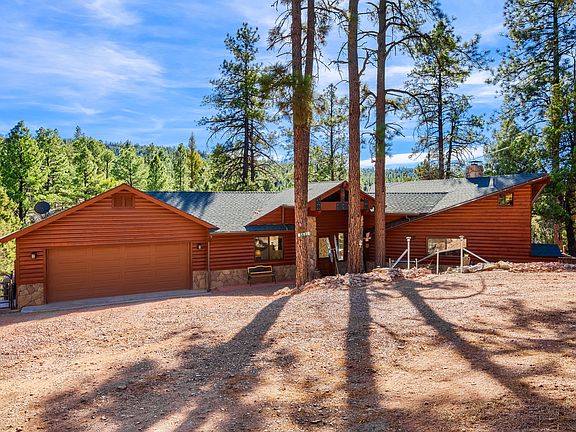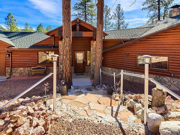 You'll love this mountain retreat on a quiet cul-de-sac in Ponderosa Springs surrounded by Nat'l Forest just minutes to the lakes at the Rim. Addition built in 2016 and recent updates made to original cabin. This unique, cozy log sided cabin is one of a kind w/great room w/vaulted ceilings, recessed lighting, stone fireplace, and floor to ceiling windows with views that will ''WOW'' you! Kitchen remodeled w/granite countertops and add'l cabinets. Loft can be used as bedroom or office w/half bath. Guest bath completely remodeled. Finished bsmt. w/new windows, could be 3rd bedroom, fitness ctr. , or game room w/separate entrance to outside stone deck. Addition in 2016 includes new master bedroom w/sliding glass door opening up to gorgeous wrap around deck, master bath & walk-in closet