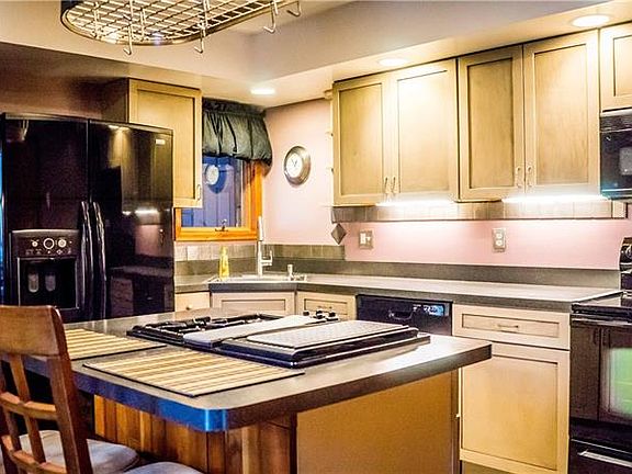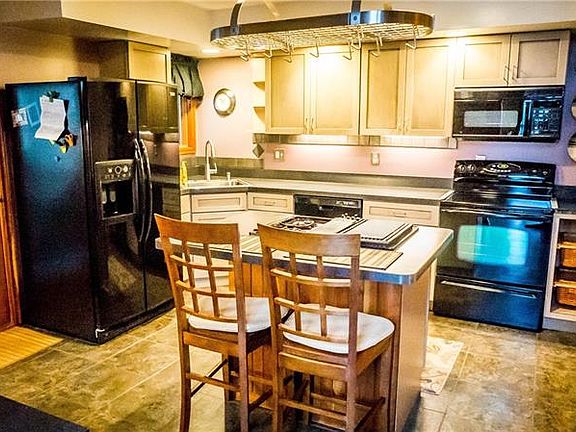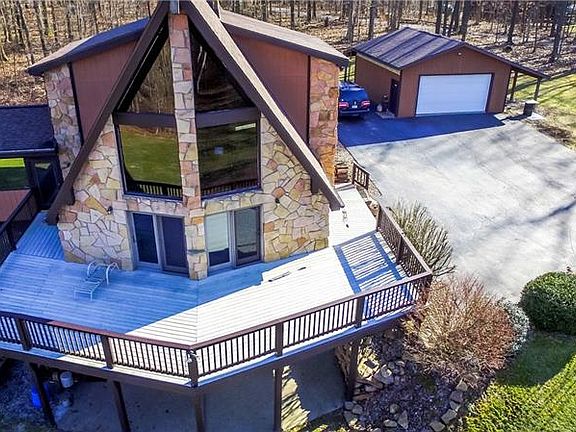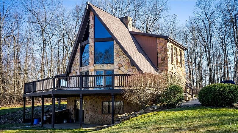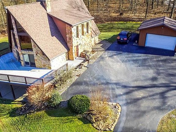 Looking for a chalet secluded in the woods? Here's your home! Enchanting one of a kind custom built stone A Frame on five wooded acres! Upon entering you'll find 27 foot ceilings in living room complimented with a stone fireplace that features wood burning insert. Master suite offers sitting area overlooking the living area, Spacious 16x14 three season room is found off the fully equipped kitchen. Finished lower level offers a second kitchen and third fireplace w/insert. Outside you'll enjoy being surrounded by nature on the wrap around deck overlooking the private rear yard. Large 24x24 detached garage features 200 amp service.