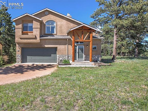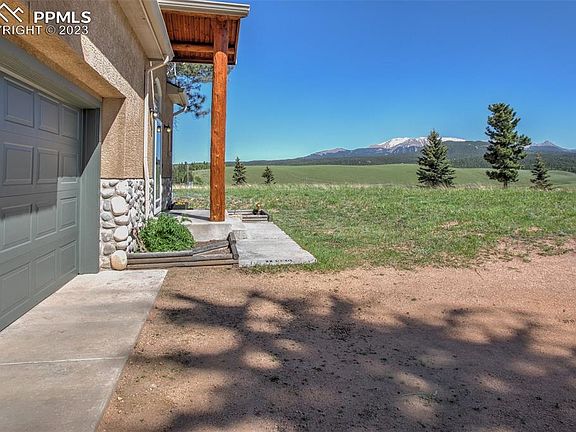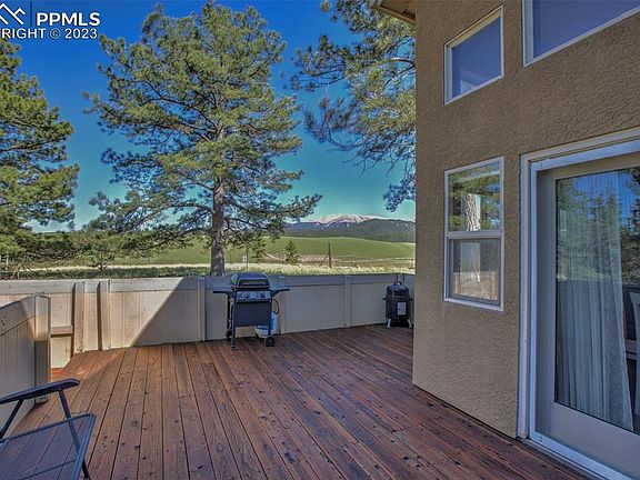 Excellent location in Divide, just 7 minutes from Woodland Park! Stunning views of Pikes Peak from this detached townhome. Low maintenance stucco and stone exterior, with log timber beamed accents. Two story vaulted ceilings in the great room with views of Pikes Peak to the South in this bright and cheery space! Main level includes all ceramic tiled flooring, soaring ceilings in the living room and dining room with a gas log fireplace and walkout to the rear deck and fenced yard. Powder room included on the main level. Comfortable kitchen includes stainless steel appliances, with a new oven/stove and counter bar seating, w/ pantry storage, and laundry nearby. An office/family room area adjoins the kitchen, with access to the 2 car attached garage. The upper level overlooks the living room and dining area, and has had brand new carpeting and bathroom flooring installed! This level includes 3 bedrooms, the bright master suite adjoins a 3/4 bathroom with a walk-in closet, with 2 extra bedrooms plus a full bathroom completing this level. Corner location, spacious open space surrounding the home, and views of Pikes Peak make this home the complete package! Newer roof + new water heater in 2022 as well.