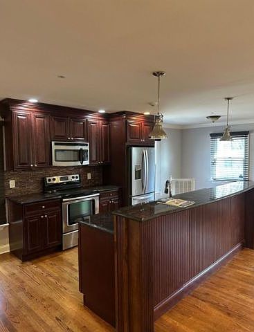 Stunning fully renovated 1 bedroom apartment in Smithtown with a spacious open-concept layout. Features a modern kitchen with a center island, cherry cabinets, granite countertops, and stainless steel appliances. Includes a laundry room with a washer and dryer, central air, and beautiful wood floors throughout. (Internet 7120557)