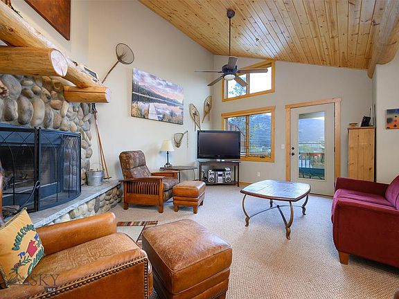 Mountain views beckon from all three levels of this Pines Phase II unit. Perched above Hidden Village, this spacious 4 bedroom/4 bath floorplan offers solitude away from the hustle and bustle of Big Sky, yet is close to recreation and amenities. Each bedroom has its own bathroom and each floor features at least one bedroom with two bedrooms and laundry on the middle level. The lower level is above ground and offers a private family room with wet bar, patio and hot tub. Open kitchen, dining and living room easily flow for everyday use or special entertaining. River rock wood-burning fireplace, log accents and vaulted tongue & groove wood ceilings give this property the Montana feel you've been looking for! Lots of room makes for an ideal residence or vacation home to enjoy Big Sky skiing, fly fishing the blue ribbon Gallatin river, adventures in Yellowstone Park or exploring the Gallatin National Forest.