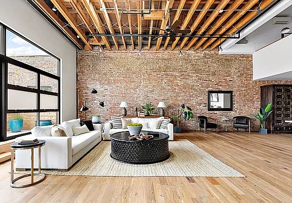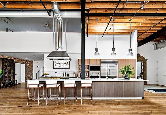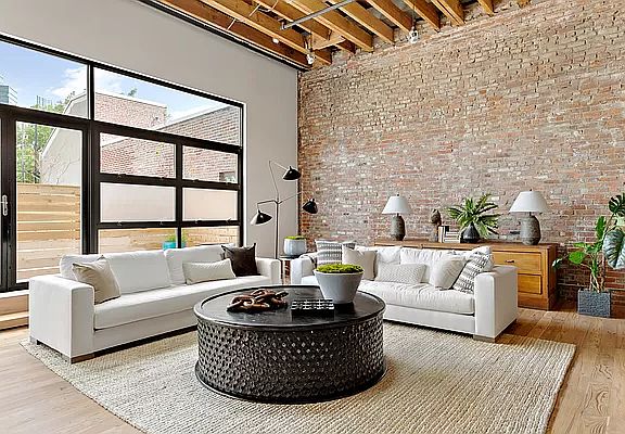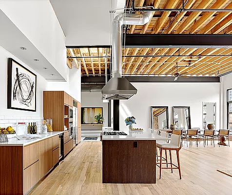 Authentic historical Greenpoint penthouse loft loaded with architectural details: 16 foot ceilings, original exposed wood beams, antique teak flooring imported from India, massive windows - almost floor to ceiling and original steel columns. The spectacular renovated loft is in a former button factory and was previously used as an artist studio due to the exceptional light. The open plan layout has views of the Manhattan skyline and an enclosed private 1007 square foot terrace with water views. The sun drenched 40' long living space features an open dining room/living area and separate brand new chef's kitchen with custom cabinetry by Porcelanosa. Top of the line appliances include SubZero, Wolf and Miele (including oversized Wolf vented cooktop, wine fridge, two dishwashers and extra wide refrigerator). A large antique, handmade door imported from India opens to one of the bedrooms. The Primary Bedroom features two separate large walk-in closets, and an oversized bathroom with a soaking tub and shower, skylight, handmade mosaic tiles and a Room & Board double sink vanity. In addition to the 3 generously sized bedrooms (each with a private full bath and walk-in closets), there is a 2nd floor office for this live/work space that can accommodate 4 people and is ready to go with built-in desks and file cabinets. In the third bedroom there are two oversized electronically operated skylights with built-in operable shades. This penthouse loft has private roof rights with 1144 feet of buildable terrace. This is the ultimate Brooklyn loft at it's best, truly a rare find. Greenpoint Lofts is a boutique loft conversion on the Greenpoint waterfront with low common charges. This serene location is close to the best of Greenpoint: across from Achilles Heel, down the street from the Bakeri and the Faurschou museum. It's close to the Michelin starred Oxomoco as well as some of the best bars, shopping and galleries in NYC. The ferry is just 2 blocks away and there is a possible designated parking space with a Tesla charger for rent. This loft is also zoned for live/work use.