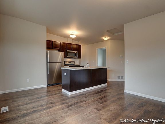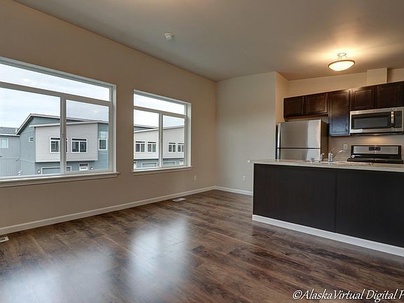 Available Now. Modern open floorplan with views of the mountains and a tiny fenced yard. 3 Bed 2Bath, open concept townhouse style condo. In unit laundry and single car garage. Renter pays gas, elec, & trash. Pet on approval with additional 50.00 per month rent. Bryan & Raney RE/MAX Dynamic Eagle River Renter pays gas, elec, & Trash. One year lease. Dog on approval with additional 50.00 per month. We do full background check to include credit, employment, etc.
