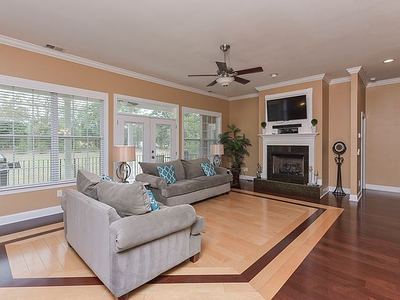 • RoomLivingRoomFeatures: Fireplace, French Doors, Floors-Hardwood, Molding, Ceilings-High (over 9 Ft), Ceiling Fan