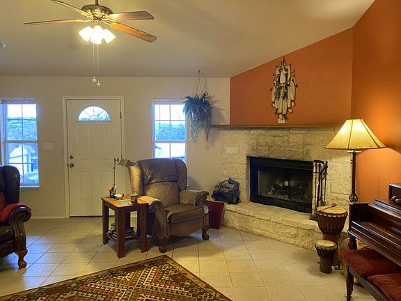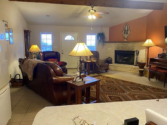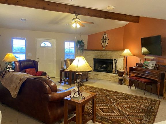 Pride of ownership is obvious with this very well maintained small acreage home tucked into a quiet cul-de-sac just outside city limits. This lovely 3 bedroom, 2 bath home has a nice open floor plan, spacious living area with high ceilings, a nice stone fireplace, large kitchen/eating area, split bedroom arrangement and tile floors throughout. The covered outdoor porch has views of a nice, private, low maintenance half acre yard and the side firepit is a nice place to sit and enjoy pretty long distance views from the front. Great home and neighborhood just a few minutes from town! (TVs and brackets do not convey)