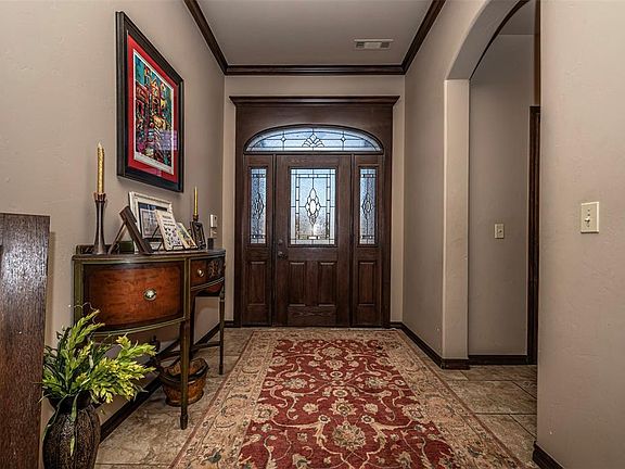 The kitchen is both spacious and practical, with a gas stove and solid surface countertops, it's great for entertaining! The beautiful iron fence surrounding the backyard creates a warm and inviting atmosphere. The back yard has a great covered patio, equipped with a wood-burning fireplace and a hot tub, it's ideal for unwinding in the evenings. Additionally, the three-car garage includes an inground storm shelter to ensure your safety during Oklahoma's unpredictable weather. This stunning home has so much to offer—call today to see it for yourself!