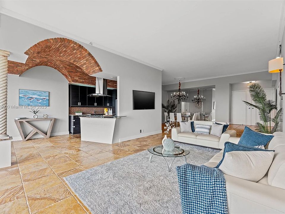 Experience penthouse living with breathtaking golf and city panoramas from a 50-ft balcony. This 2-bed, 2-bath residence spans 1,557 sq ft and blends architectural drama with modern sophistication. The featured vaulted brick ceiling and natural stone floors create a European-inspired ambiance, complemented by a remodeled kitchen with sleek cabinetry, granite counters, and mosaic accents. Spa-style baths showcase designer tile work and custom finishes, while motorized blinds add comfort and convenience. An assigned storage room on the same floor provides useful utility. The Consulate, a full-service tower within The Lands of the President, offers 24-hr security, pool and spa, fitness center, tennis, social room, and more. One assigned covered parking spot and plenty of guest spaces.