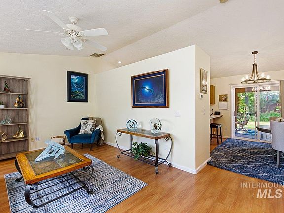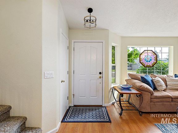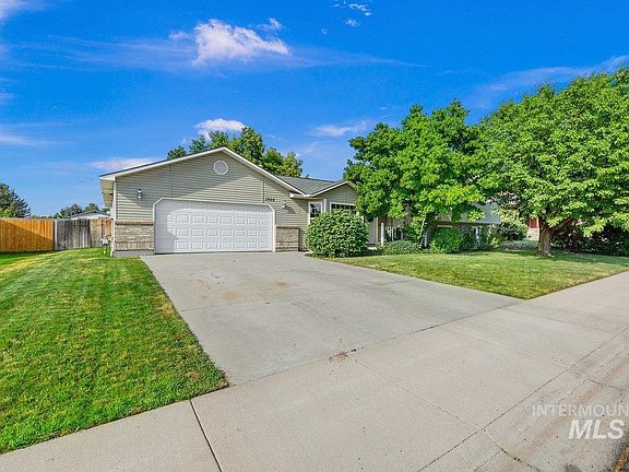 $25k price drop! Excellent Meridian location close to shopping and the freeway, south-facing and just down the road from Mountain View HS with room for everyone. Oversized tandem 3 car garage plus shop area with heat and A/C. This 4 bedroom, 2.5 bath home features a separate naturally lit living room and cozy family room, plus a craft room loaded with workspace and storage and a comfortable kitchen area with a gas stove and breakfast bar. Easy to maintain hard surface flooring installed on the entire main level. The master suite includes vaulted ceilings, natural light and a walk-in closet with built-ins behind mirrored doors. Lower level is naturally cool through the summer and is a welcome retreat from the heat. 2 automatic fans were installed in both sections of the attic. Fully fenced with Boat/trailer parking on the west side, save the cost of a rental space! The private backyard boasts a huge covered deck, mature landscaping with plenty of gardening opportunities, a hot tub and gas BBQ stub.