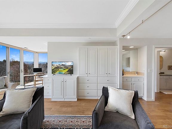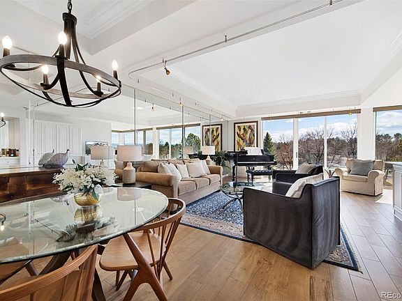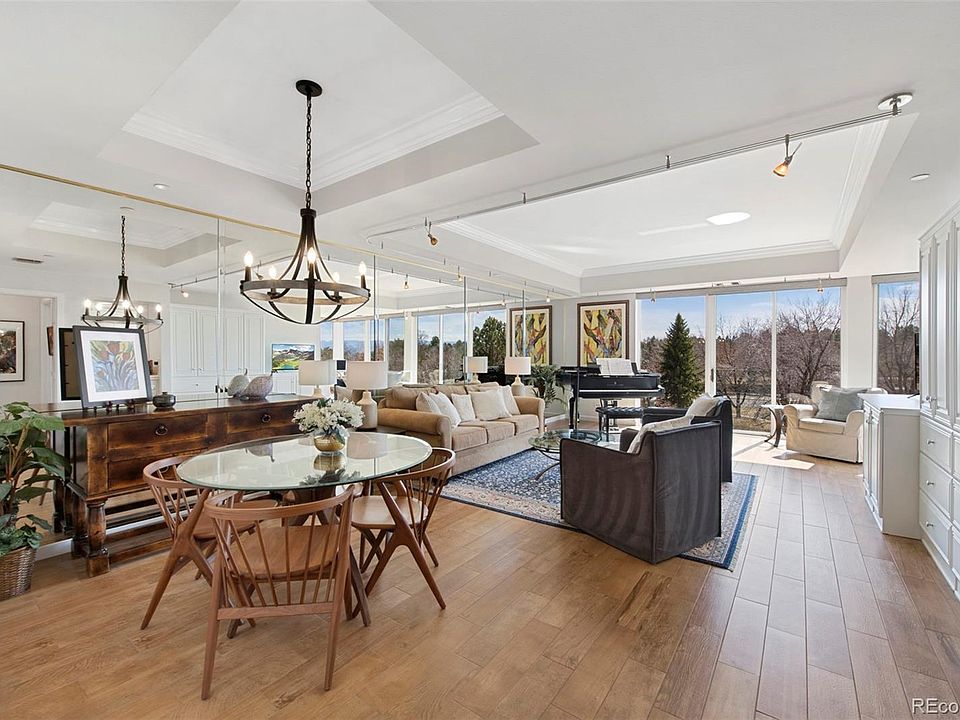 Majestic Mountain Views of the Front Range from this Southwest Corner Unit with floor-to-ceiling windows, all graced by motorized shades, plus upgrades galore! The Waterford sits on 7.5 acres of manicured lawns with an abundance of mature trees along with waterfalls and ponds--right out the windows of this condo. Entering the Living Room with built-ins, a serving bar, and adjacent dining area, is a wall of floor-to-ceiling mirrors reflecting the mountain vistas....It seems there are mountains all around! Gorgeous new wood-style, plank tile floors with new paint and upgraded lighting throughout. The kitchen opens to the views, too, via its pass-through window and sports 42-inch cabinets, a side-by-side refrigerator with paneled fronts, Bosch dishwasher, newer electric stove/oven/hood with artisan-created countertops. Spacious primary bedroom with corner floor-to-ceiling windows with motorized shades and stunning mountain views....Large walk-in closet with built-ins. The upgraded, primary bathroom has a brand-new shower, new quartz countertops, and new tile with a Jacuzzi tub and large window. Secondary bedroom and another full bath. Two-year-old, full-sized washer and dryer and cabinets in the unit's private laundry room. Two parking spaces 38 and 53 and large storage unit B-49. Well-appointed fitness center with indoor/outdoor pool, sunbathing area, grills and entertaining area with fire pit and lovely gardens. Whirlpool spa. Steam rooms. Lit Tennis/Pickleball courts. Three overnight guest suites and party rooms--the Grand Salon or the Fitness Center w/fireplace, both with kitchens. Come home to The Waterford at Cherry Hills, an executive lifestyle in a park-like setting. You will love it here!
